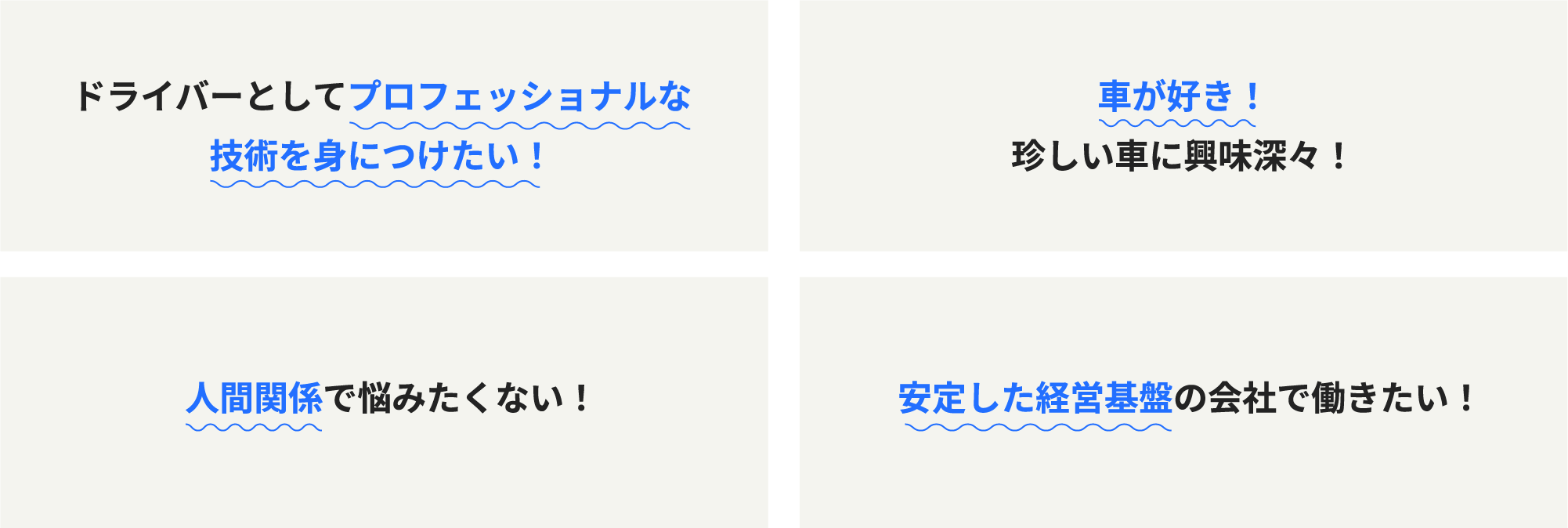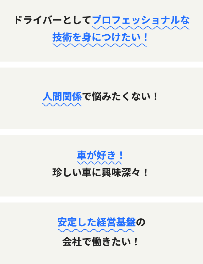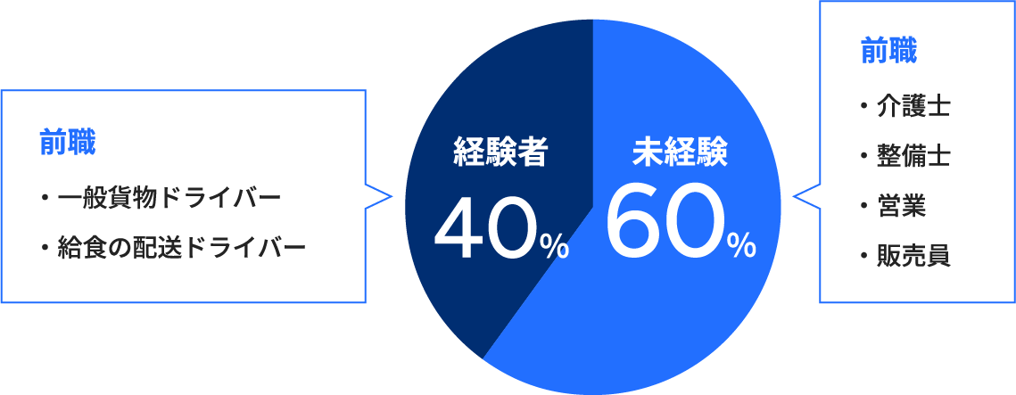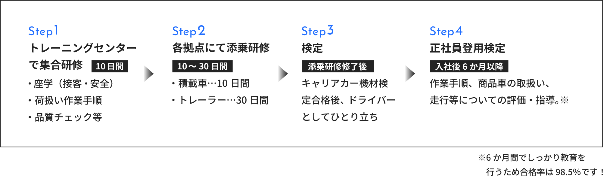 当社では長い研修期間を設けており、明確なカリキュラムに沿った育成をおこなっています。入社後10日間は、トレーニングセンターで座学を中心に接客・安全・荷扱いなどの基礎を学ぶことからスタート。その後は先輩ドライバーに同乗して実務を体験し、次のステップでは、自分が運転しながら先輩の指導を受けます。覚えることは多いですが、すべては安全のため。充実した研修があるから、未経験でも安心してドライバーデビューできます。