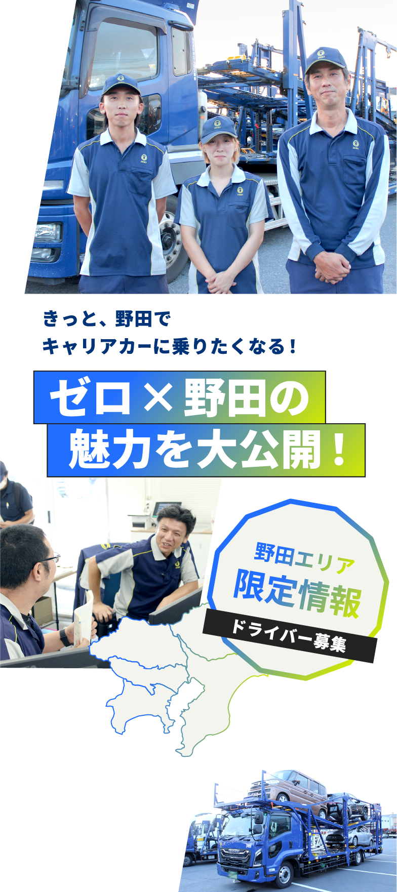 自衛隊時代に大型免許を取ってたこともあり、免許を活かせる仕事を探していたんです。他のドライバーの仕事も検討したのですが、車が好きだったこともあって、いろんな車に触れられるゼロに決めました。入社して感じたのは、とにかく働きやすい環境だということ。最近結婚したんですが、新婚旅行で1週間の休みも取ることができました。みんな気さくで、助け合いながら仕事をしているから、居心地もいいんですよね。あまりに環境がいいから、学生時代の野球部の仲間にも紹介しました。安心して長く続けられる職場だと思います。
