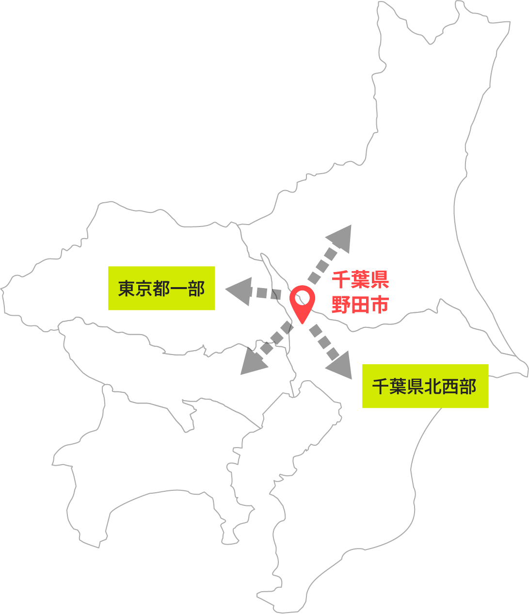 - 野田市を含む千葉県北西部、茨城県、埼玉県、東京都の一部。けん引免許を取得してトレーラーへステップアップした場合は、ゼロの拠点間輸送がメインになり、関西エリア及び、名古屋・金沢への長距離輸送もおこないます。